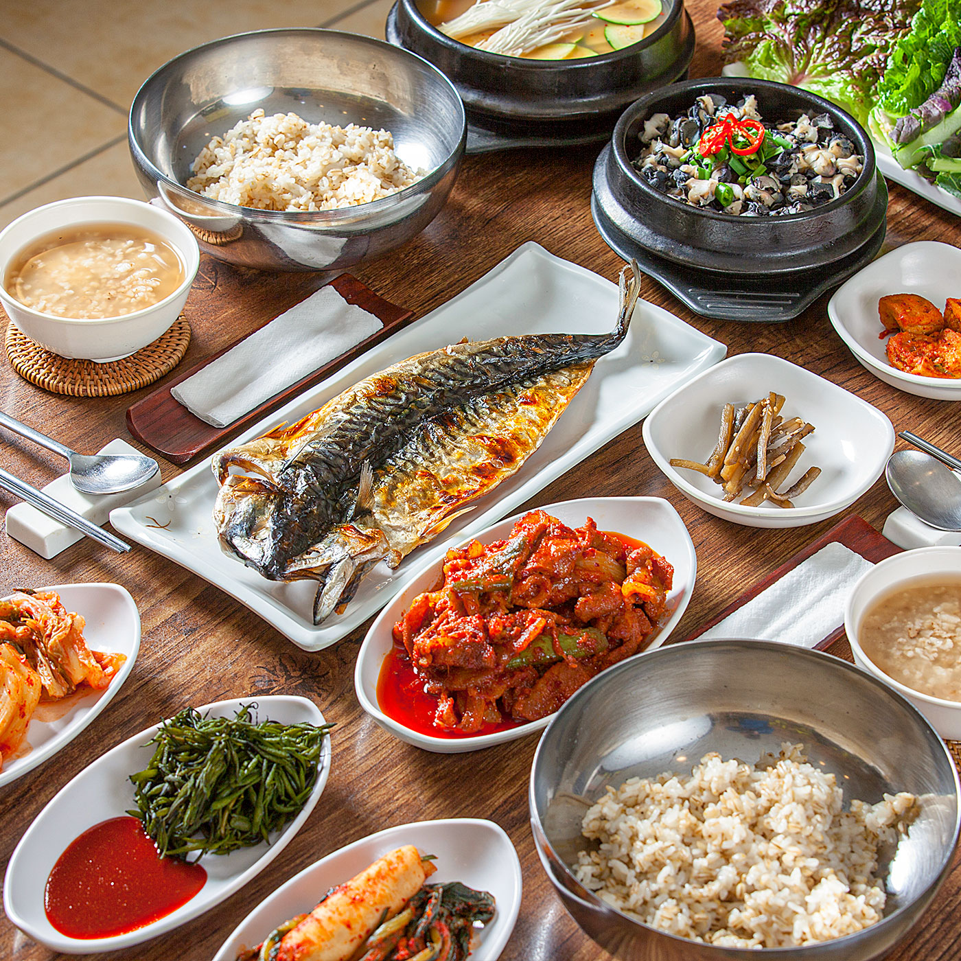 짭조름한 고등어자반과 쫄깃한 우렁이가 가득 들어간 우렁 쌈밥
